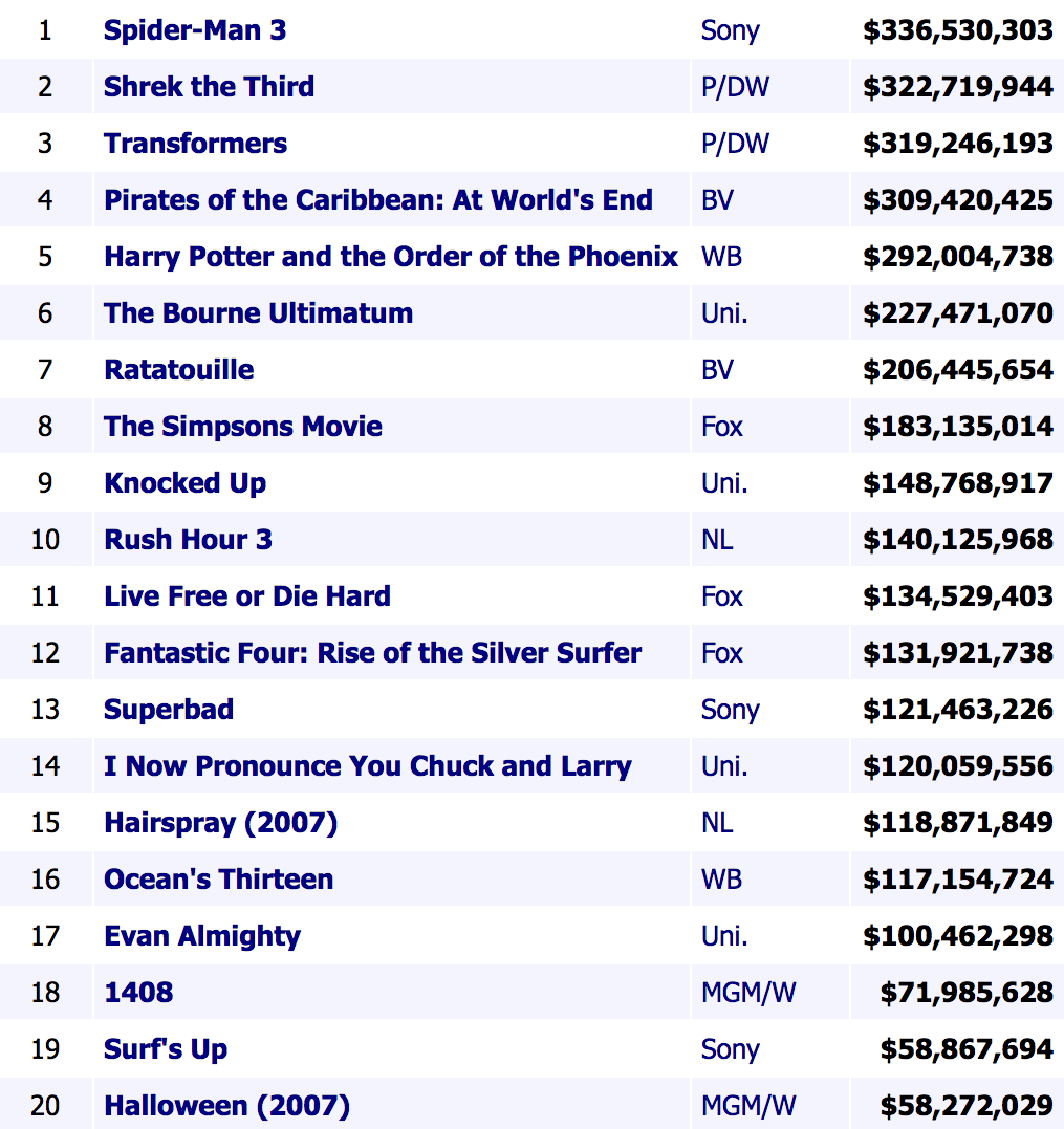 All in all, 2007 had a decent slate of movies. Sure, the number one movie of the summer (Spider-Man 3) is garbage. But franchise fans were definitely on board for these Harry Potter and Jason Bourne installments. Even Transformers and Pirates weren’t quite as terrible back then as they are today.